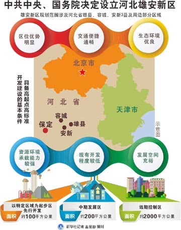 中共中央、国务院印发的通知称,河北雄安新区规划范围涉及河北省雄县、容城、安新三县及周边部分区域,地处北京、天津、保定腹地,区位优势明显、交通便捷通畅、生态环境优良、资源环境承载能力较强,现有开发程度较低,发展空间充裕,具备高起点高标准开发建设的基本条件。