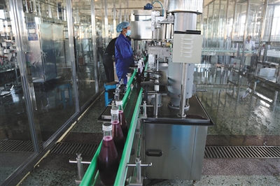 8月6日,黑龙江森源科技食品开发公司职工正在加工生产蓝莓果酒、蓝莓果汁、蓝莓饮料等蓝莓系列产品。