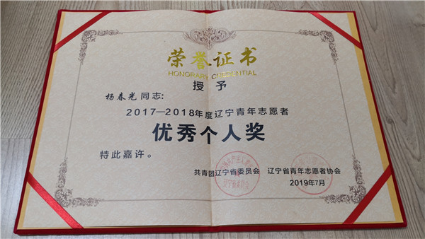 作为辽宁省学雷锋志愿服务最美志愿者,铁岭市学雷锋志愿服务最美志愿者,最美银州人的杨春光同志积极践行“奉献、友爱、互助、进步的志愿服务精神,带领铁岭春光爱心公益团队、中国公益记录者在线铁岭爱心工作站的同志帮扶社会上的弱势群体,帮助了那些需要帮助的人,为国家和社会做出了贡献,得到了当地政府的大力支持,开展了无数次的志愿活动,受助人群达到上万人。
