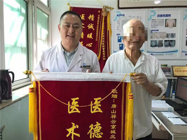 中国公益记录者在线河北讯(公益记录者 陈沛玉 通讯员 罗玉生)9月18日,唐山市路北区88岁的郑先生将一面绣着“医德高尚、医术精湛”的锦旗亲自送到了唐山京城皮肤医院门诊部董春仓主任手里。