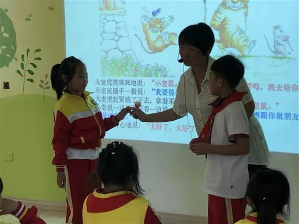 大党峪中心小学严小芳老师给二年级的小同学带来了精彩的童话故事《小老鼠和大老虎》,孩子们在阅读、角色体验中体味了什么是友情,并学习了如何与朋友友好交流,初步建立了与他人、与社会的联系与关爱。