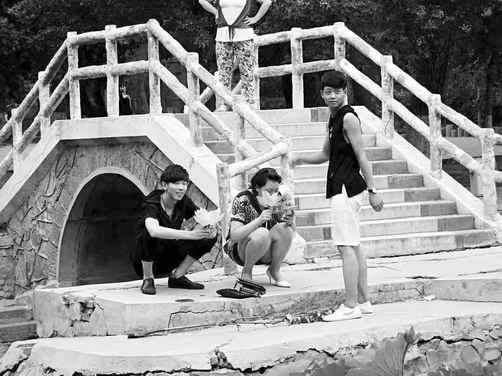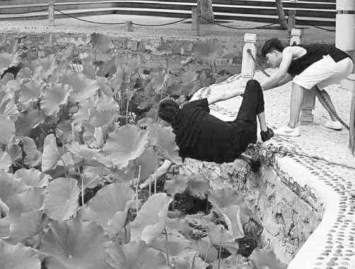 记者在微信里看到,6幅照片上的“摧花手”涉及3名青年,其中2名男青年,1名女青年,他们的手里至少拿着2朵荷花,其中女青年拿着一朵荷花举在脸庞位置,用手机自拍。而在其中一幅图片上,清晰地显示出两名男青年采摘荷花的动作:一名男青年拽着另一名男青年的手臂,被拽手臂的男青年则一脚踩着池边,一脚踩着池壁,把手伸向下方的荷花。