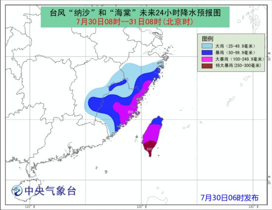 降水预报:30日08时至31日08时,福建大部、浙江中南部、江西东部、台湾等地有大雨或暴雨,其中,福建中东部、浙江东南部、台湾等地的部分地区有大暴雨,台湾局地有特大暴雨(250-300毫米),最大小时雨强可达80毫米。