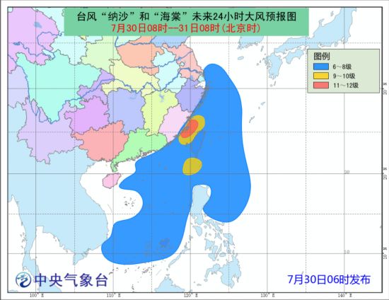 人民网北京7月30日电 据中央气象台网消息,中央气象台7月30日06时继续发布台风黄色预警:今年第9号台风“纳沙”的中心已于昨天(29日)晚上7点40分前后在我国台湾省宜兰县东部沿海登陆,登陆时中心附近最大风力有13级(40米/秒),中心最低气压为960百帕。登陆后,“纳沙”穿过台湾北部地区,并于昨天(29日)晚上10点30分前后移入台湾海峡,随后于今天(30日)早晨6点钟前后在福建省福清市沿海登陆,登陆时中心附近最大风力有12级(33米/秒),中心最低气压为975百帕。早晨6点钟其中心位于北纬25.5度、东经119.6度,中心附近最大风力有12级(33米/秒),中心最低气压为975百帕,七级风圈半径150-250公里,十级风圈半径80公里。