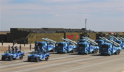由8辆海红旗-9B舰空导弹车和8辆鹰击-12A舰舰导弹车组成的海军导弹第1方队亮相。这两款新型导弹都是夺控制海权的“杀手锏”武器。鹰击-12A导弹,主要担负打击大中型水面舰艇及编队任务,瞬间可击毁敌大中型舰艇,有“海空霹雳”之称。