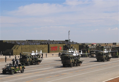 由40架三型无人机组成的无人机方队,以空军和陆军混编模式首次亮相。参阅装备为某新型通信干扰无人机、某新型雷达干扰无人机和某新型反辐射无人机,是我军无人机装备的重要组成部分,均由我国自主研发。