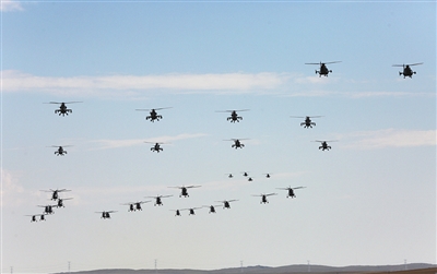 刚刚组建的陆军空中突击旅首次亮相。由陆军第83集团军空中突击某旅和陆航部队的3个旅共同编成的空中突击梯队呼啸而至。10架武装直升机率先开辟空中通道,8架武装直升机护卫18架运输直升机,搭载精锐力量,突入作战区域。