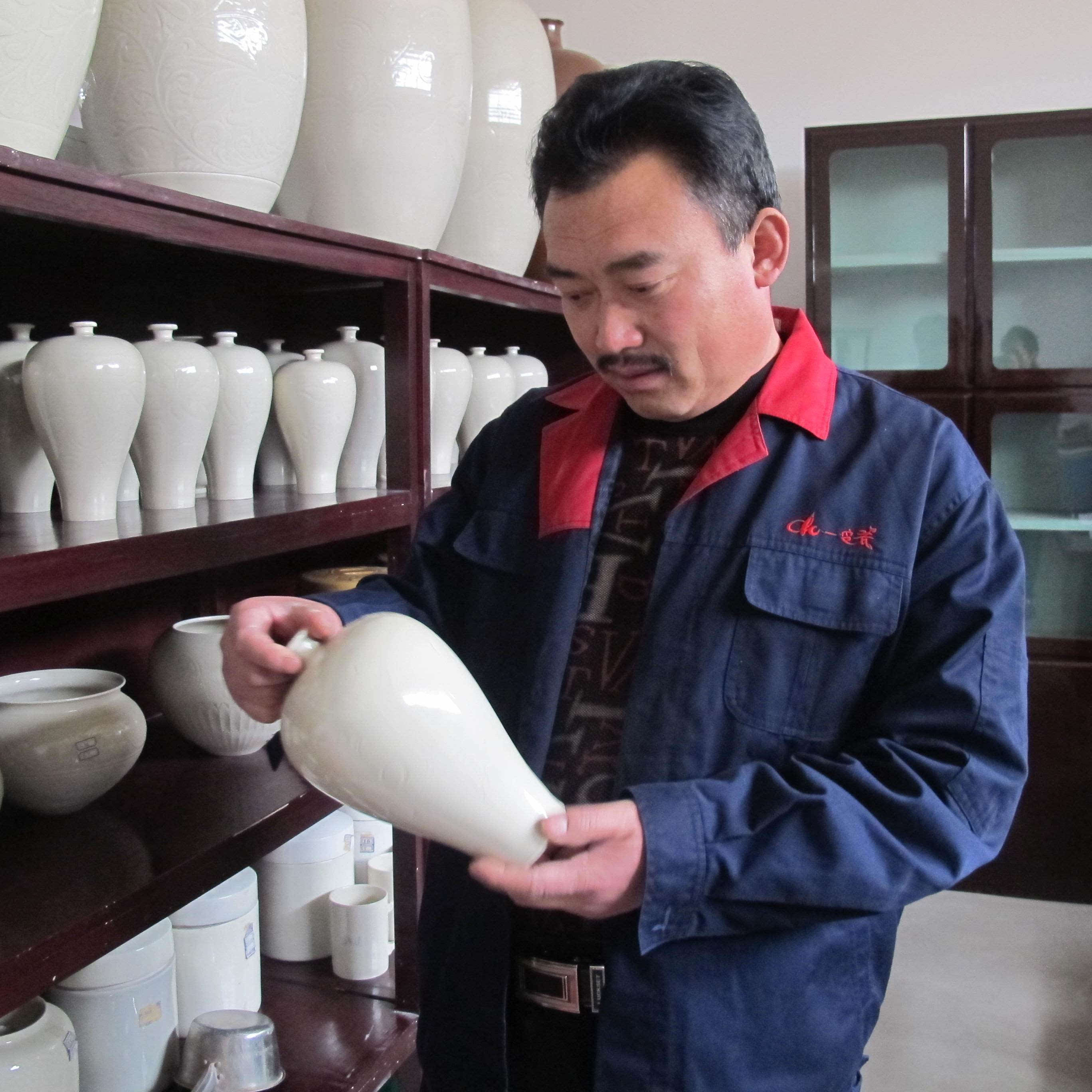 念念不忘,终有回响.2004年,王淑昌被陈文增大师看中,入职高手云集的陈氏定窑瓷业有限公司,从事定窑细白瓷的原料烧成工艺。有了十年粗瓷加工的基础,又有蔺占献大师培养,王淑昌很快独当一面,醉心于定瓷烧制。一次,手拉坯这一环节出现了问题,成品频频出现惊裂现象。一批瓷器烧好了,要出窑了,就有部分瓷器已经惊裂,当时没裂的过几天还是会开裂,这个缺陷是致命的。 因为一窑瓷器,从原料筛选、淘洗、加工、成型、刻花、装饰等工序,耗费了大量的人力物力,最后出炉却成了废品,王淑昌难受极了。这时,富有经验的蔺占献大师告诉他,之所以会出现惊裂现象,主要是坯釉的膨胀系数不一致造成的。一句话点醒梦中人,王淑昌立刻跟同事沟通,经过对技法的调整,终于解决了惊裂的问题。也正是经过此事,王淑昌意识到,制作细瓷比粗瓷要复杂得多,更具有挑战性,自己还没入门。于是,他开始下苦功研究定窑瓷器的各项工艺。