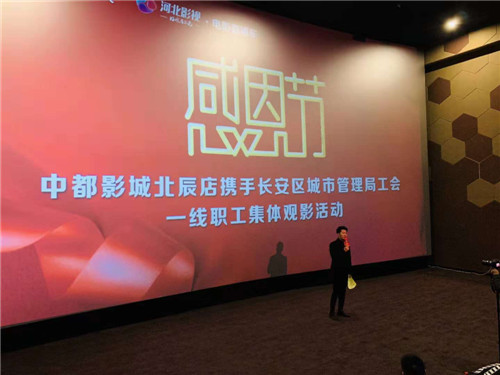 2018年11月22日上午10点石家庄长安区城市管理局工会携手中都影城北辰店、河北广播电视台影视频道电影直通车栏目组举办“感恩节公益观影”活动,邀请来自长安区的社区医务工作者、爱心人士、社区老人、普通居民等 余人免费观看了电影《无名之辈》。